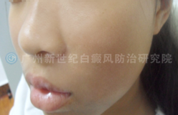 ▲病史:患者于2年前无明显诱因额头出现小片状浅白斑,后扩大、增多,右侧鼻部,内眼,脸颊嘴角散在片状白斑部分睫毛变白。