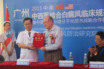 峰会上,伯纳德·葛菲教授代表美国华盛顿大学医学院和西雅图瑞典医疗中心与广州新世纪白癜风防治研究院医生代表刘斌医生签订了合作协议,葛菲教授将为广州新世纪白癜风防治研究院提供技术指导和远程会诊。作为世界308之父,伯纳德·葛菲教授在参观广州新世纪白癜风防治研究院308nm准分子光治疗室后,赞言道:“贵院在对308准分子光治疗仪的操作规范上和临床应用上达到了水准,我很高兴地看到308设备在贵院发挥了应有的作用。
